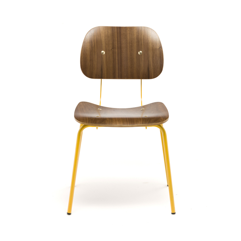 Gold Apple furniture factory manufactures industrial dining chair with bentwood seat and back. A lovely complement to any dining room table or office, this modern metal chair has curved plywood seat and back. Plywood seat and back offers an ergonomic curve to promote comfort. The Walnut laminate finish delivers maximum durability and allows easy cleaning. Metal frame with powder-coated steel legs includes nonmarring floor glides to protect your floors. They’re connected to a light, streamlined steel frame, which shows to a modern look, It is a popular dining room chair, office chair, and restaurant and cafe chair.
